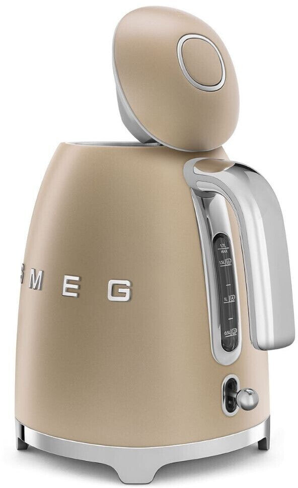 Der SMEG KLF03CHMEU Wasserkocher in Matt-Champagner kocht schnell 1,7 Liter Wasser für bis zu 7 Tassen Tee. Mit seinem auffälligen Retro-Design und dem Edelstahlgehäuse ist er ein Blickfang in jeder Küche.